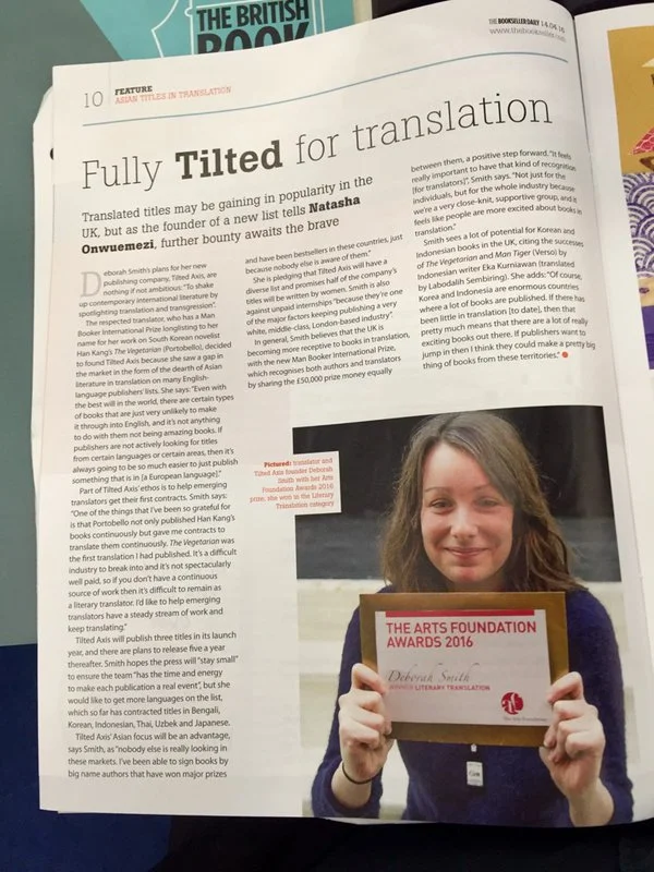 You couldn't walk round the fair without tripping over a TAP author: Okka popped up at the Poetry Pavilion, run by our brilliant sales team Inpress, for readings & discussion on poetry & mental health; Hamid Ismailov introduced his latest-in-English, The Underground (neatly coinciding with his Uzbek-original story being featured in the Guardian), while Prabda Yoon rounded us off with a panel on, ahem, 'How the Postcolonial World is Challenging the Metropolitan Centres of Publishing' - despite the fact that Thailand is distinguished by being one of the few Asian countries never to be colonised. Having said that, we're all About 'tilting the axis of world literature from the centre to the margins, thereby challenging that very division', so it was great to have yet more confirmation that the margins are where it's at. And the icing on the cake? A full-page feature in the Bookseller. Hell yes. We have arrived.